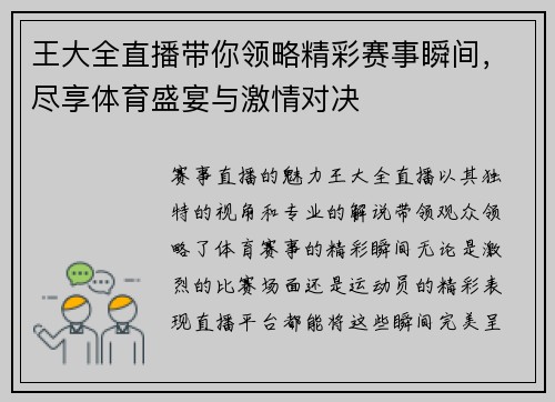 王大全直播带你领略精彩赛事瞬间,尽享体育盛宴与激情对决