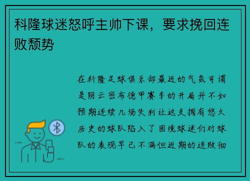 科隆球迷怒呼主帅下课,要求挽回连败颓势